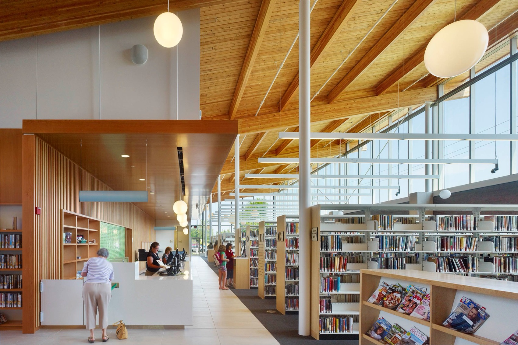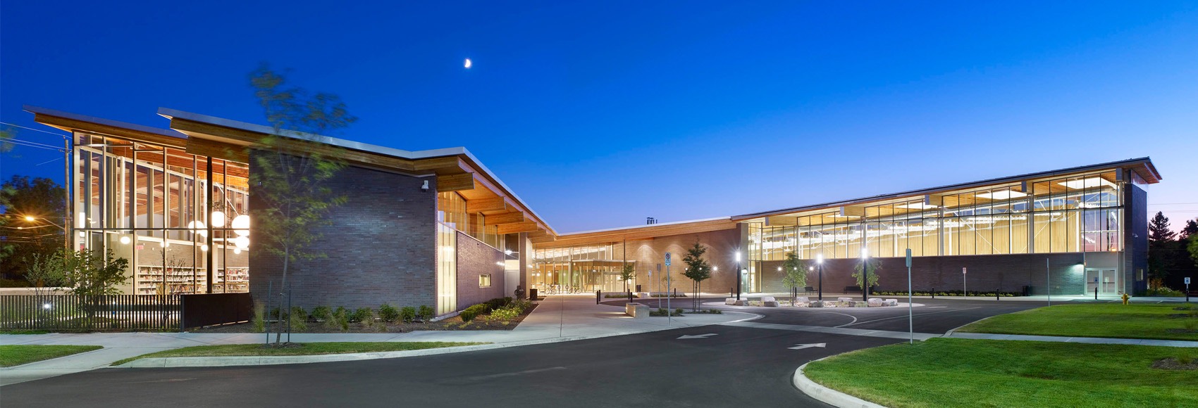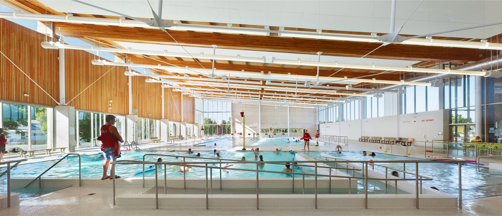 Working in association with Perkins+Will, MZE Architects led construction administration and field review for the Kiwanis Aquatics Centre & Dr. Huq Family Branch Library, addressing the City’s need for expanded recreational and library facilities. The 4,644sm building integrates seamlessly into Lester B. Pearson Park, utilizing an underused site and enhancing connectivity through pedestrian pathways, indigenous landscaping, and an outdoor amphitheater. Designed around two splayed wings, the structure responds to the site’s geometry and streetscape, with a distinctive butterfly roof inspired by Niagara’s park pavilions. Large overhangs and canopy elements regulate sunlight and glare while reinforcing a fluid indoor-outdoor connection. The extensive use of natural materials, including limestone, clay brick, and Douglas Fir timber, enhances sustainability and harmonizes with the park’s natural setting, creating a vibrant and enduring community space.